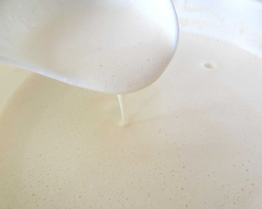 - Тесто для тонких блинчиков на молоке должно быть по консистенции сметаны или густых сливок, но следите, чтобы оно не было чрезмерно жидким, как вода. В противном случае ваши лепешки будут попросту рваться на куски.