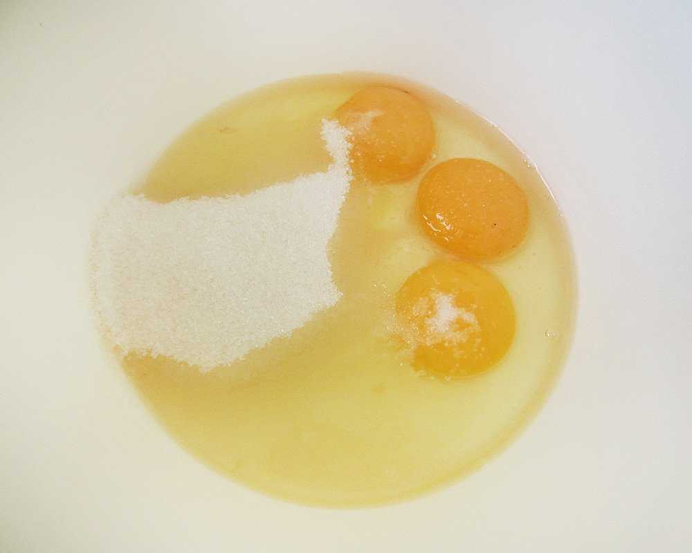 1. Разбейте в миску яйца и добавьте сахар и соль. Хорошенько взбейте венчиком до образования легкой пенки.