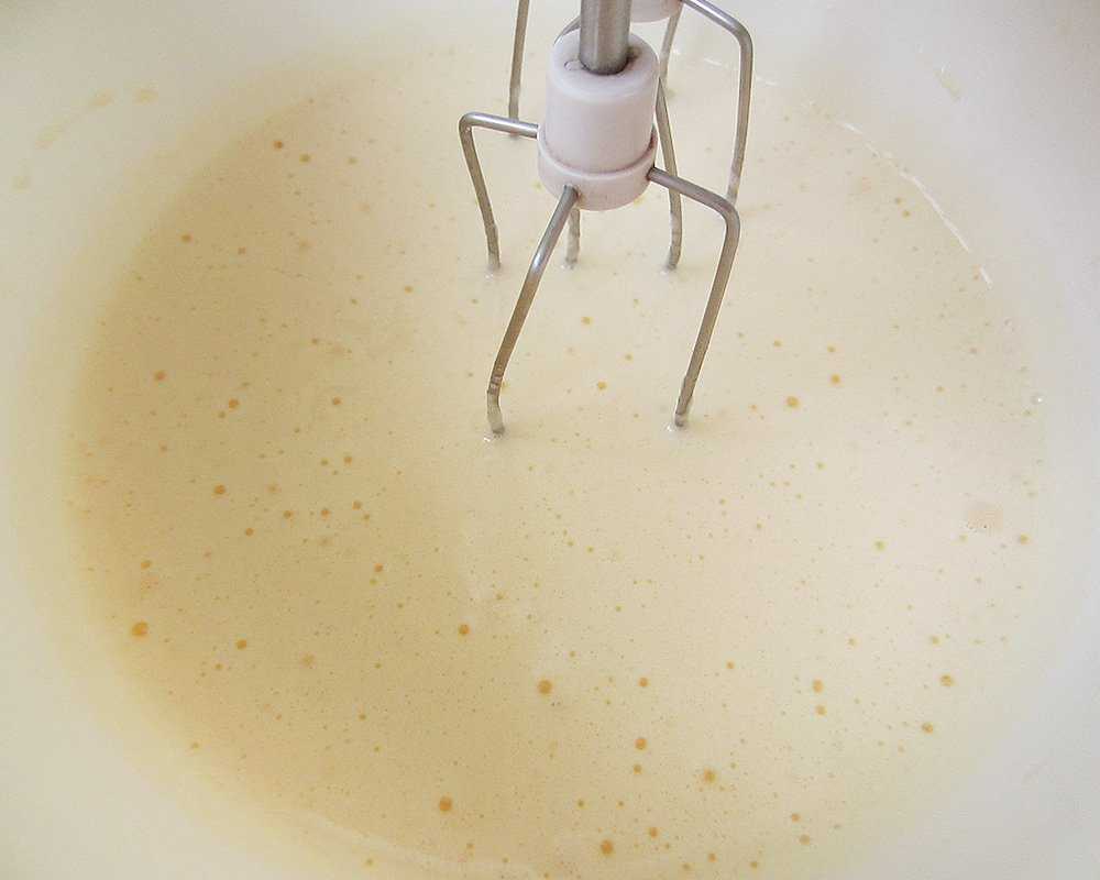 Лучше использовать именно миксер, т.к. вручную придётся очень хорошо потрудиться и затратить в два раза больше времени на взбиваение — но если его нет, то вооружаемся венчиком и приступаем.