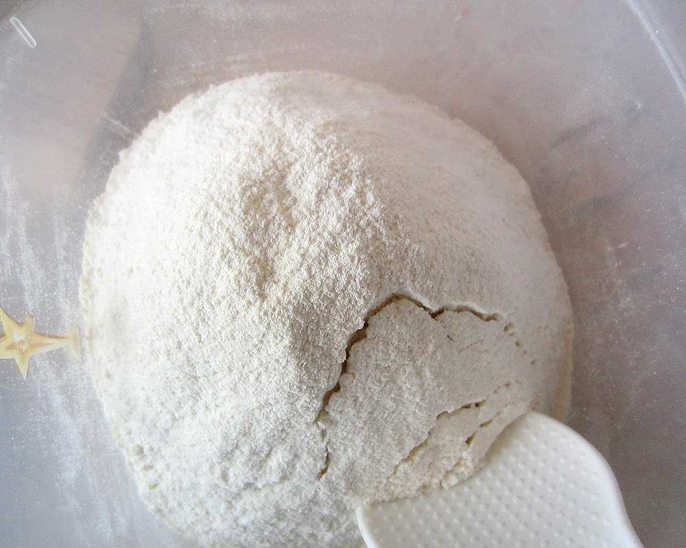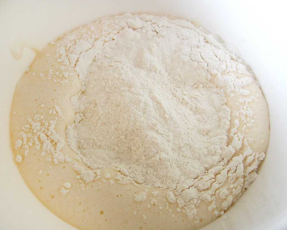 5. Просейте через сито муку и добавьте ее сразу всю в будущее тесто. Теперь нужно хорошенько его замешать, пока не растворятся все комочки. Густое тесто размешивается проще жидкого, поэтому о кондиции мы доведем тесто позже.