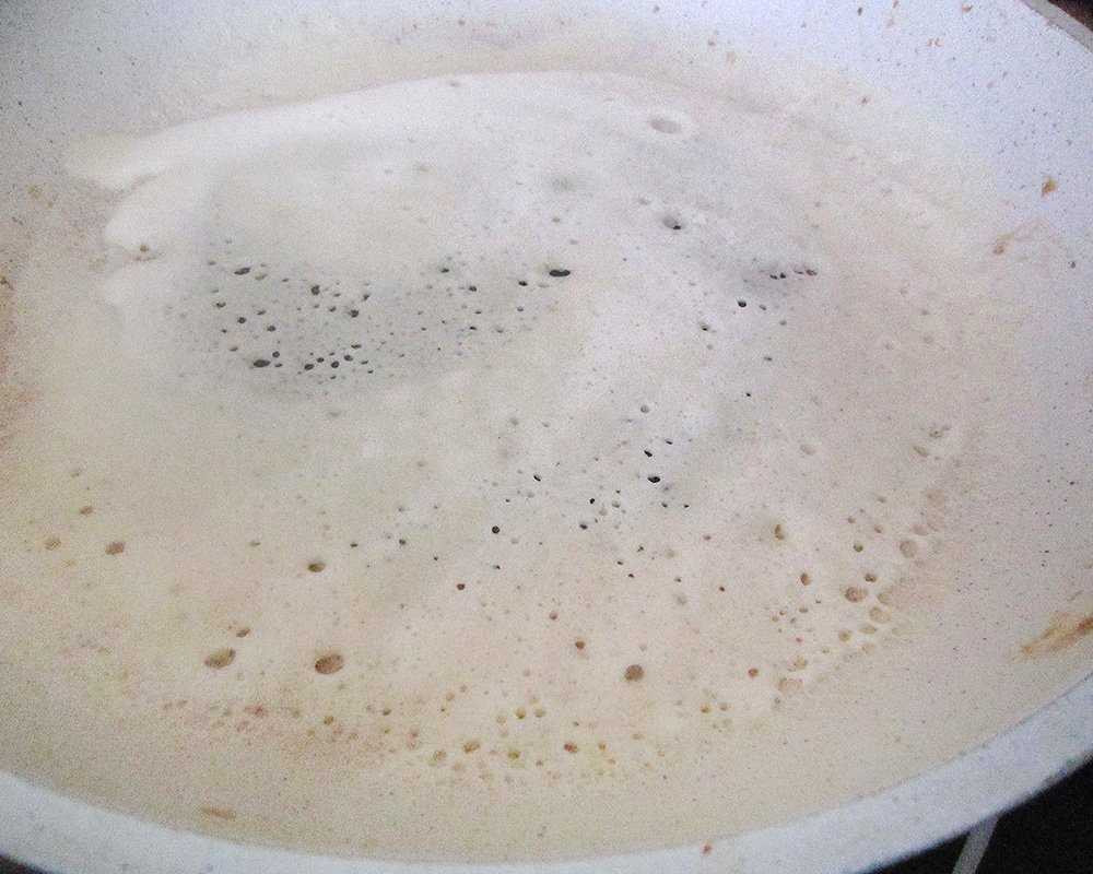 7. Налить небольшую порцию теста, поворачивая сковородку в одну из сторон, равномерно распределить его по всей поверхности и испечь, пока нижняя сторона не станет румяной. Верхняя поверхность покроется небольшими дырочками. Чем дольше будет настаиваться тесто, тем больше будет дырочек.