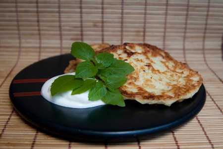Готовые кабачковые блины складываем аккуратной стопочкой и подаем к столу со сметаной.