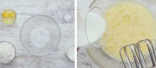 Яйца взбиваем блендером. Сначала — просто с солью. Затем вливаем молоко комнатной температуры.