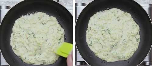 При помощи половника набираем порцию теста и выливаем ее прямо в центр сковороды. Круговыми движениями сковородки помогаем тесту растечься и образовать ровный круг.