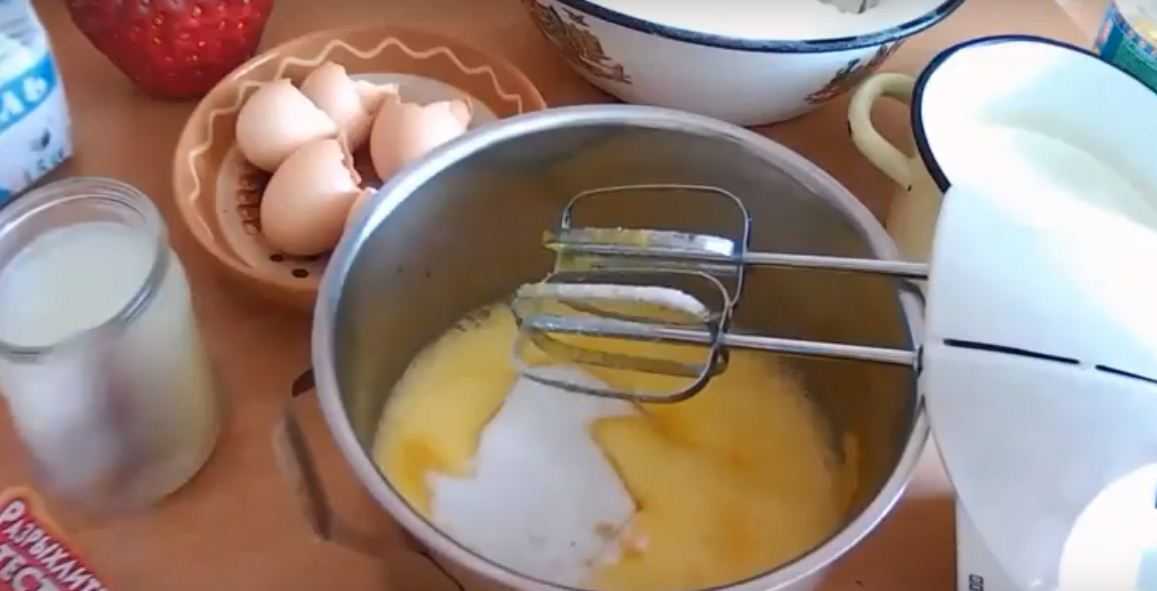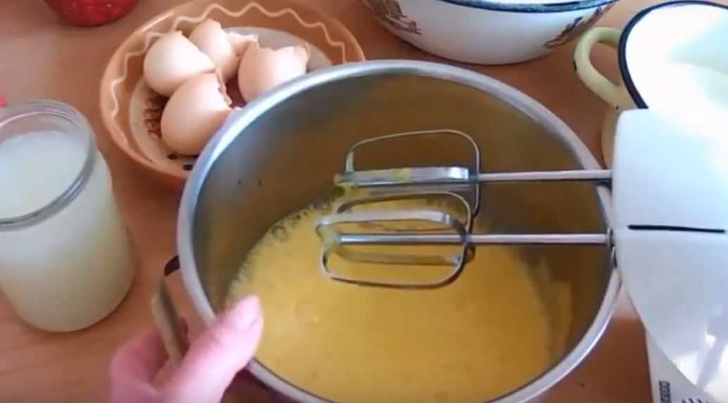 - В чашку разбиваем все яйца. Взбиваем до появления пенки.