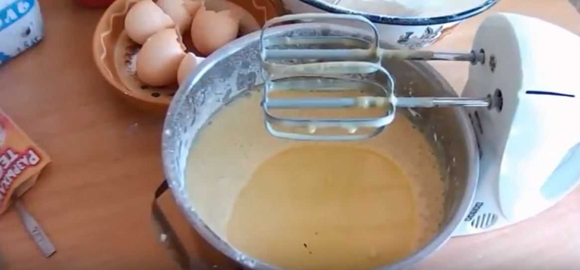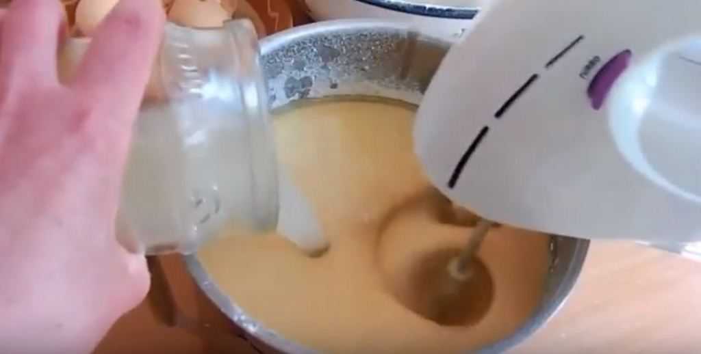 - Добавляем в смесь кипяток и тщательно взбиваем миксером или венчиком.