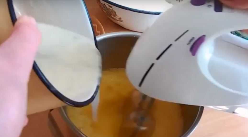 6. Теперь, выливаем оставшуюся половину сыворотки, комнатной температуры. Также постепенно, и промешивая тесто, миксером.