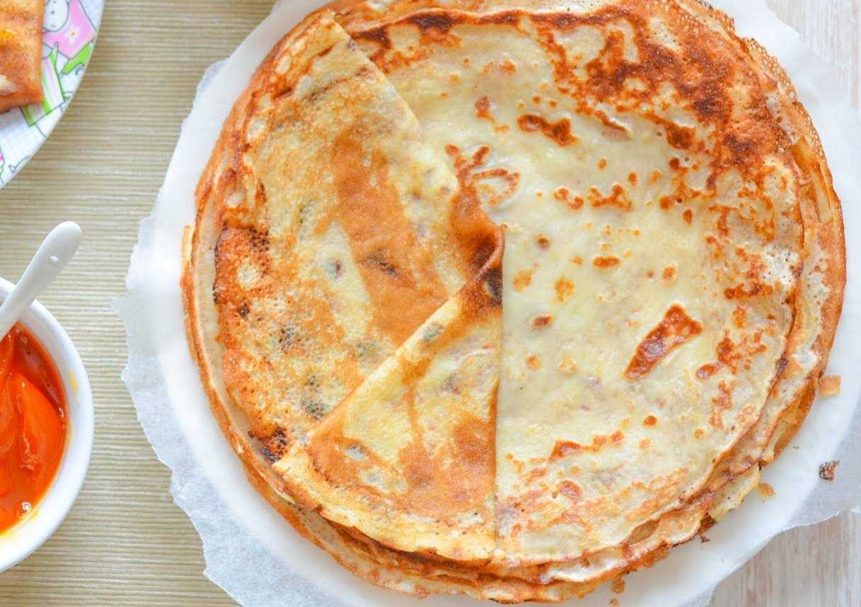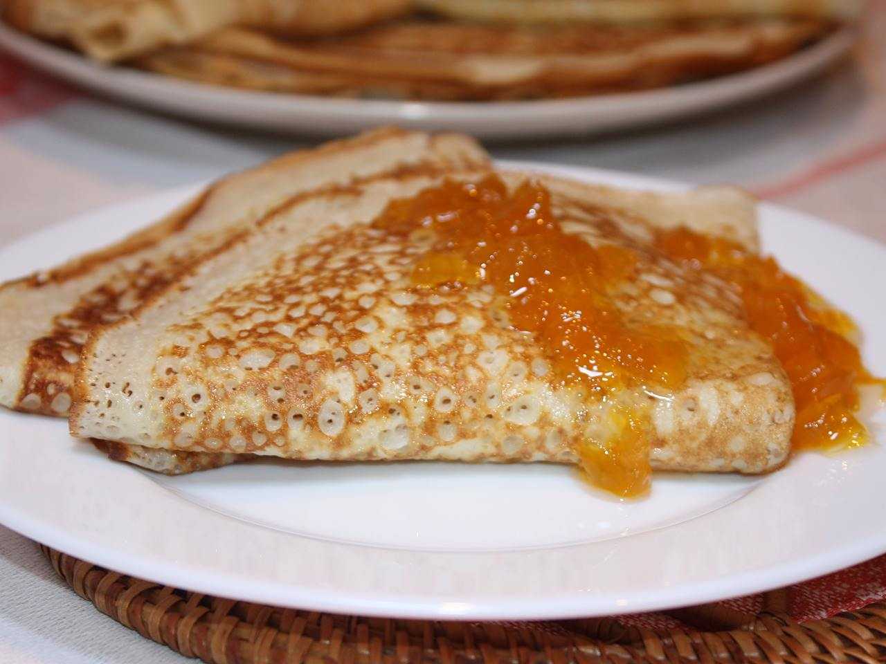 - Сковородку прогреть и смазать растительным маслом. Запечь блинчики с каждой стороны примерно по полторы минуты и сразу же подать к столу с медом, вареньем или цукатами.