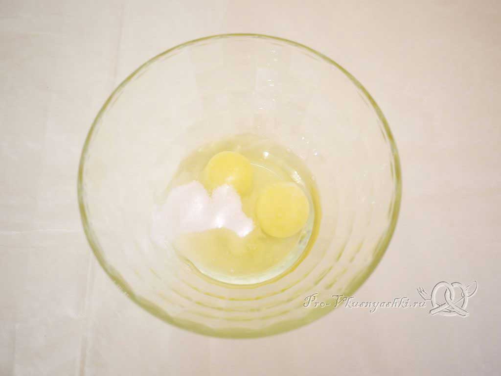 Начнем готовить тесто для блинов. Для этого в миску разобьем 2 куриных яйца, добавляем к ним соль, сахар. Теперь хорошо все перемешаем венчиком.