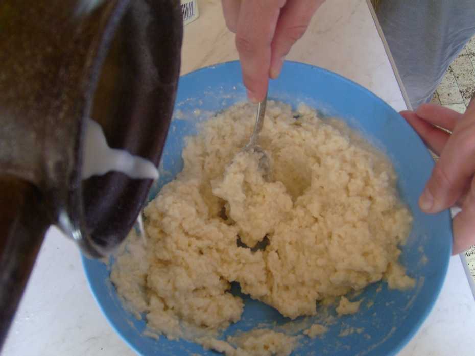 5. В горячей сыворотке размешиваем соду. Сразу пойдет реакция и обильная пена. Все хорошенько перемешиваем. Тонкой струей, постоянно замешивая, вливаем горячую массу в тесто. Вливаем растопленное сливочное масло. Старательно вымешиваем массу до однородного состояния.