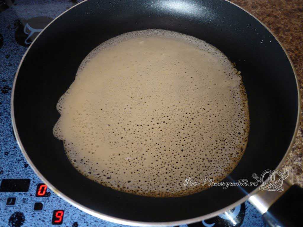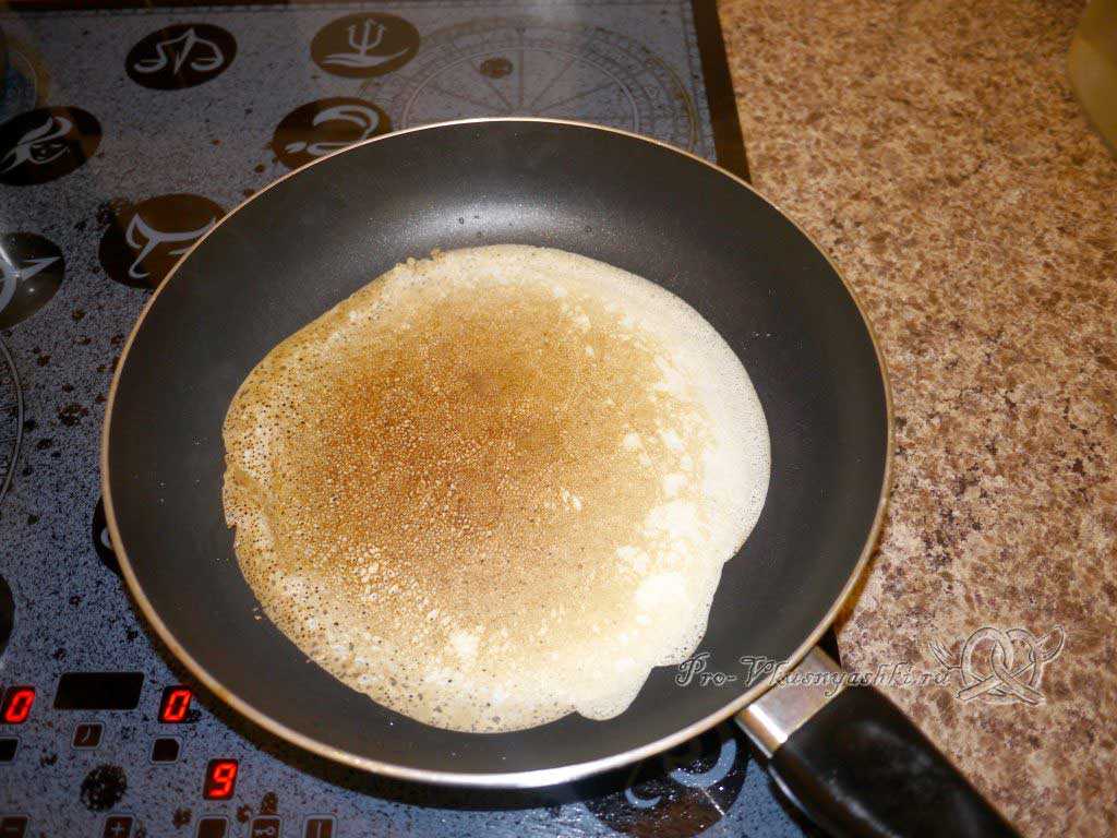 Теперь выпекаем блины. Блины нужно выпекать обязательно на хорошо разогретой сковороде, промазанным маслом. Печем с одной стороны до золотистой корочки, переворачиваем и печем еще около 1 минуты.