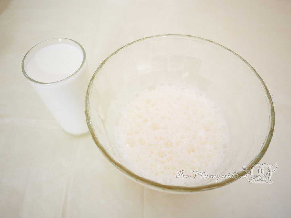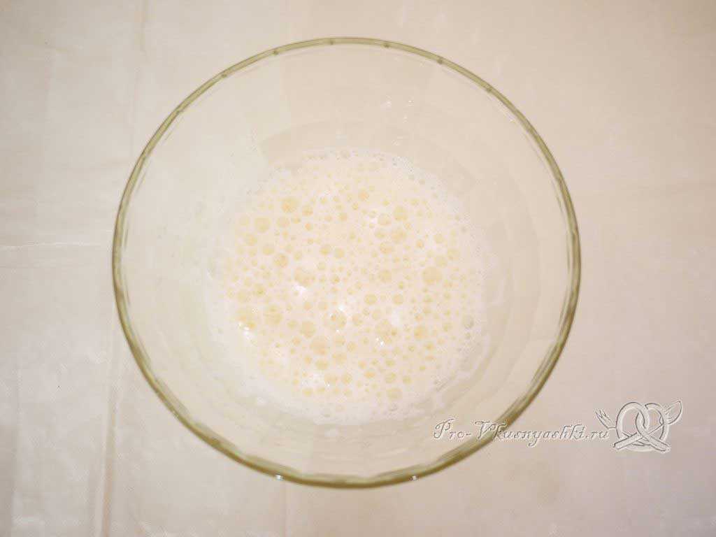 В половине стакана теплого молока развести пачку дрожжей и добавить сахар. Убираем полученную жидкость в теплое место. За это время она должна «закипеть» и забродить. Как только тесто немного остынет и будет теплым, ввести в него дрожжевую опару и тщательно перемешать.