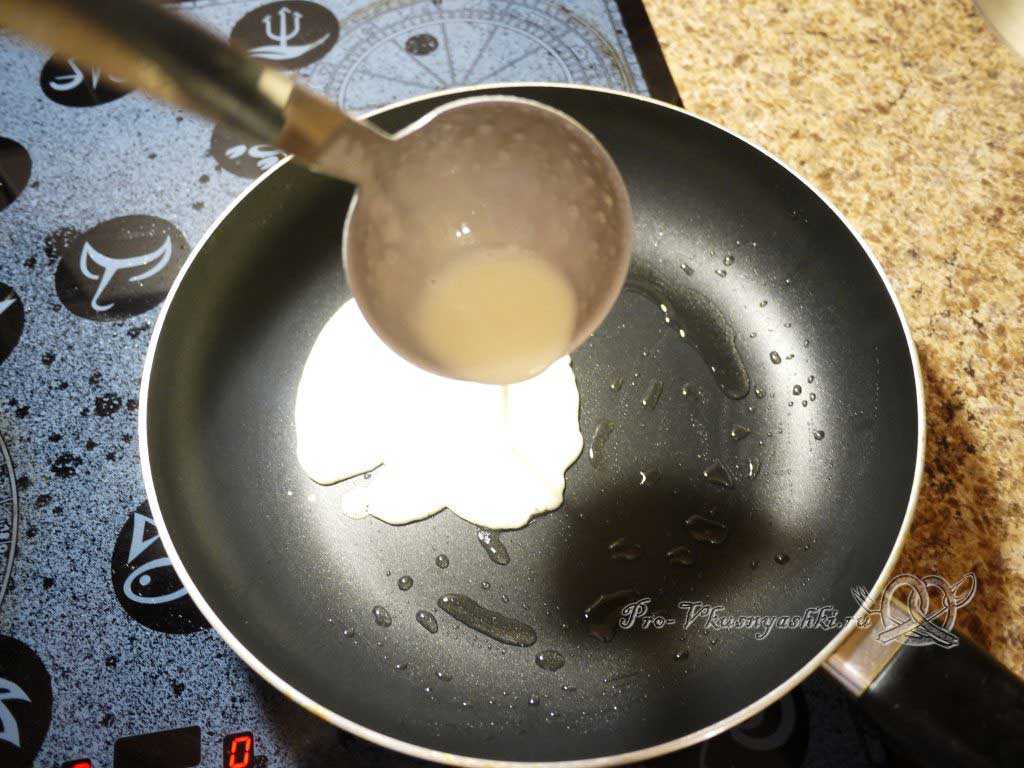 На разогретую сковороду, предварительно смазанную растительным маслом поварешкой вылить первый блин. Вращательным движением ручки распределите тесто по всему диаметру сковороды.
