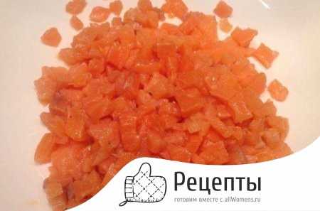 - Теперь займемся начинкой. Семгу (или любую другую рыбу без костей), примерно 300 грамм, отправляем в морозильную камеру, чтобы она немного замерзла и с ней было бы удобно работать. Минут через 30 достаем рыбу из морозилки и рубим на очень мелкие кусочки.