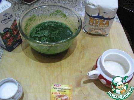 Я замешивала в комбайне. Вылить шпинатную воду в чашу комбайна, добавить 2 стакана молока, соль, сахар, разрыхлитель, и постепенно всыпать муку. Все тщательно перемешать.