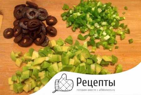 - Мелко нарезаем маслины, зеленый лук и половину плода авокадо (сразу сбрызгиваем его небольшим количеством лимонного сока).