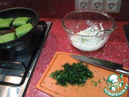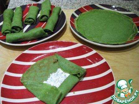 - Через полчаса достаем соус из холодильника и начинаем фаршировать наши шпинатные блинчики.