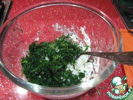 Теперь готовим вторую начинку. У меня сербская брынза (в рассоле), 250 г. Разминаем вилкой, добавляем мелко резанную зелень (какая у вас есть), без стеблей и 4 зубчика чеснока.