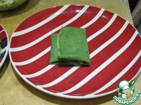 - Заворачиваем в колбаску, также, как заворачивали блинчики из шпината. Сегодня все блины у меня будут колбасками.