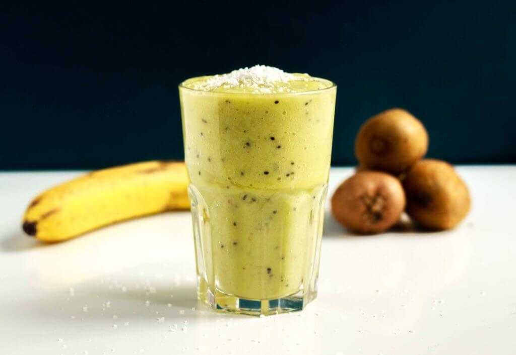 - Рецепт смузи с киви и творогом. Сначала в чашу блендера кладут три киви, очищенные от кожицы и порезанные кубиками, и одну большую ложку меда. Все взбивается и кладется в фужеры. Затем измельчаются три банана и две большие ложки творога, все аккуратно выкладывается на пюре из киви.