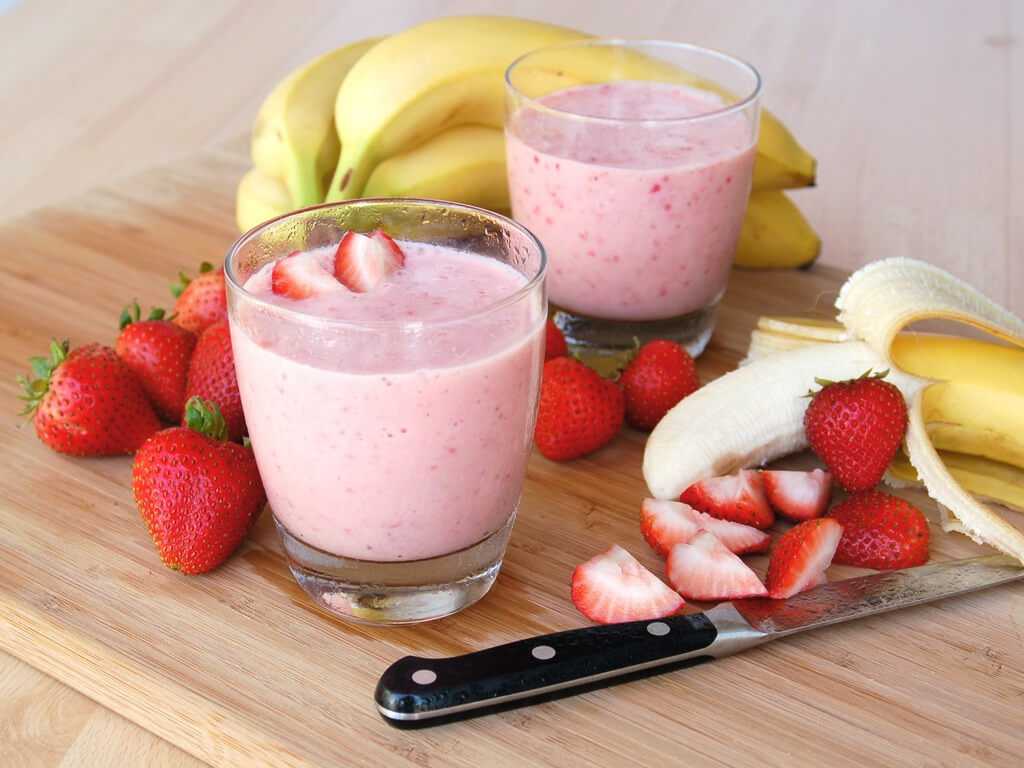 - Рецепт сытного смузи. Многие девушки предпочитают этот рецепт коктейля, так как он достаточно питателен, может заменить полноценный завтрак или ужин. Для получения такого напитка необходимо взять 1 стакан клубники и половину спелого банана. Фрукты измельчают с помощью блендера, затем добавляют стакан беспроцентного кефира или обезжиренного йогурта, взбивают. В конце добавляется нежирный творог.